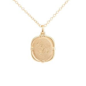 Birth flowers offer a feminine and nostalgic way to hold your beloved close. Delicately engraved by hand on a ribbon-framed pendant in our signature blend of matte and polished buttery gold. A piece to love and wear every day and then to pass down for generations.
