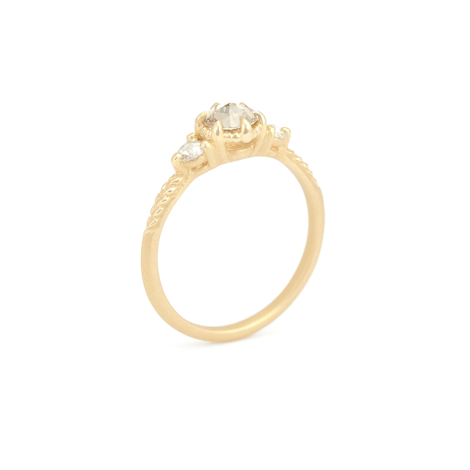 The central champagne rose cut diamond glows with honeyed warmth. Framed by the soft twinkle of white rose cut diamonds, hand-carved beading and golden botanical flourishes, you've got yourself the perfect 3-stone ring.
