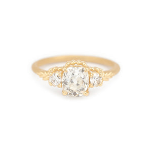 Quickly becoming one of our favorite designs, we couldn't resist adding another to our collection. Old Mine Cuts look particularly juicy when in creamy ivory tones, and we found a particularly ebullient charmer in this 1.06ct antique beauty. Paired with single cut sides, you've got a vintage lover's perfect delight