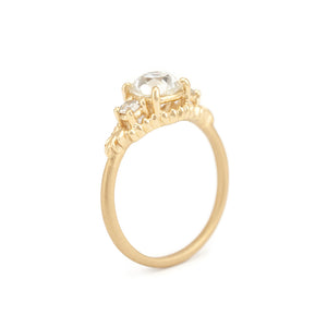 Ask Us AnythingPlucked from the hand of a fairy. Our Wood Nymph 3 Stone ring embodies whimsy and enchantment with the most delicate of leaf carvings and polished beads encircling a glittering trio of antique old mine cut diamonds.