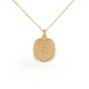 Birth flowers offer a feminine and nostalgic way to hold your beloved close. Delicately engraved by hand on a ribbon-framed pendant in our signature blend of matte and polished buttery gold. A piece to love and wear every day and then to pass down for generations.