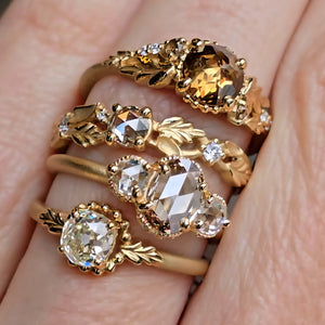 Ask Us AnythingA lyrical dance of leaves, weaving in and out, kissed with diamond dew. Gorgeous as an understated engagement ring, and a total stunner as a base for an eclectic mix of stacking rings