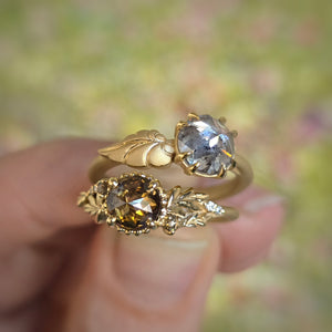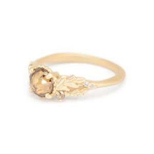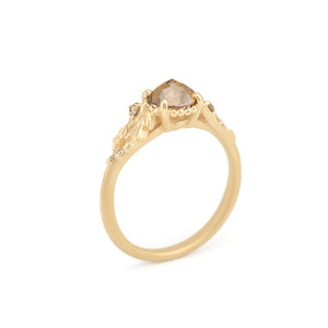 Ask Us AnythingSubtle, thoughtful details make this a very special ring. Hand carved garland shoulders, sprinkled with diamond dew and artful leaves, rise to meet an elevated beaded platform holding a fiery brown rose cut diamond. Intensely prismatic with flecks of orange and yellow in a lake of warm cognac, this diamond will keep you mesmerized