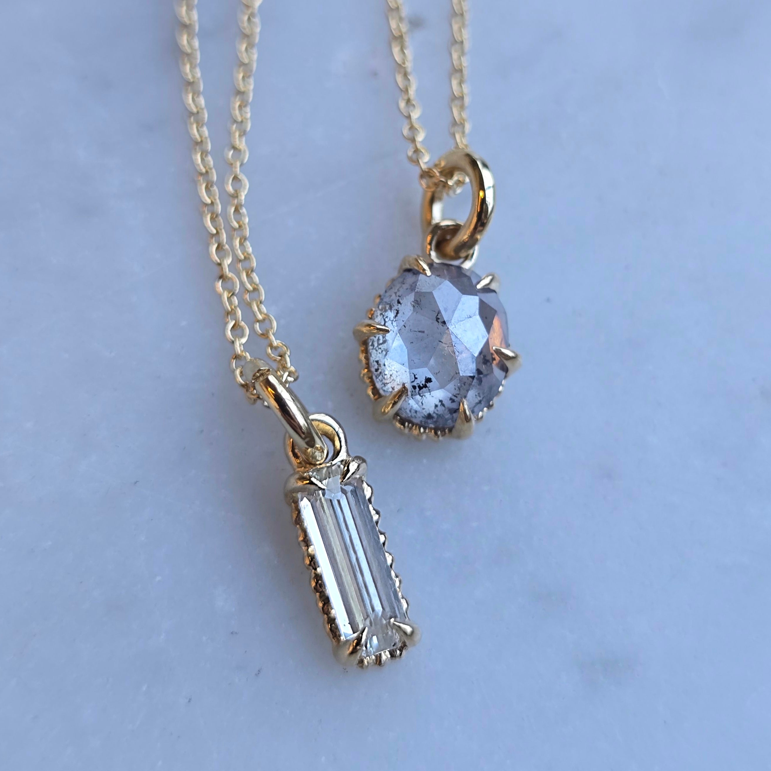 Ask Us AnythingDelicate grey glow, a sprinkling of stardust, oh yes this rose cut diamond is magic. And set in our hand-carved Evergreen necklace, with delicate beading and subtle claw prongs? PERFECT NECKLACE
