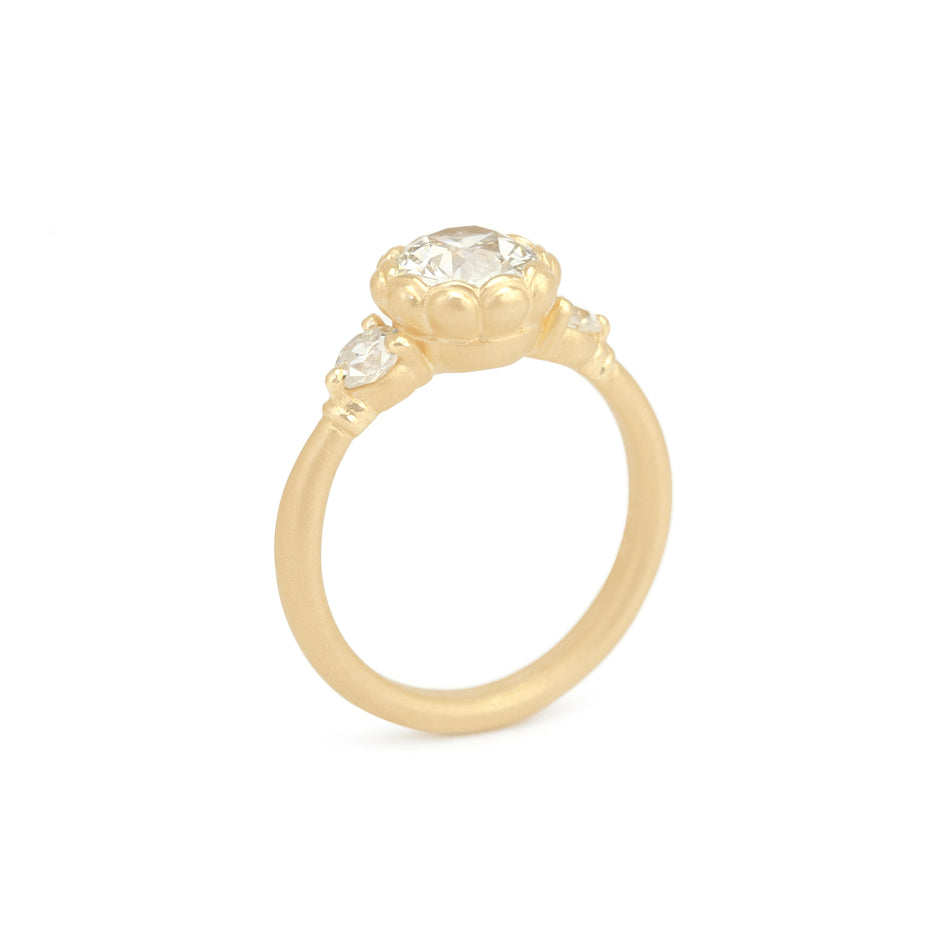 Ask Us AnythingOld world spirit with a feminine yet strong silhouette - what a lovely weight in the hand - the Vieira is a ring worthy of celebration. Double scallops flow into a softly fluted cup, enrobing an antique Old Euro diamond in golden history. Single cut side stones round out the perfect 3 Stone ring.